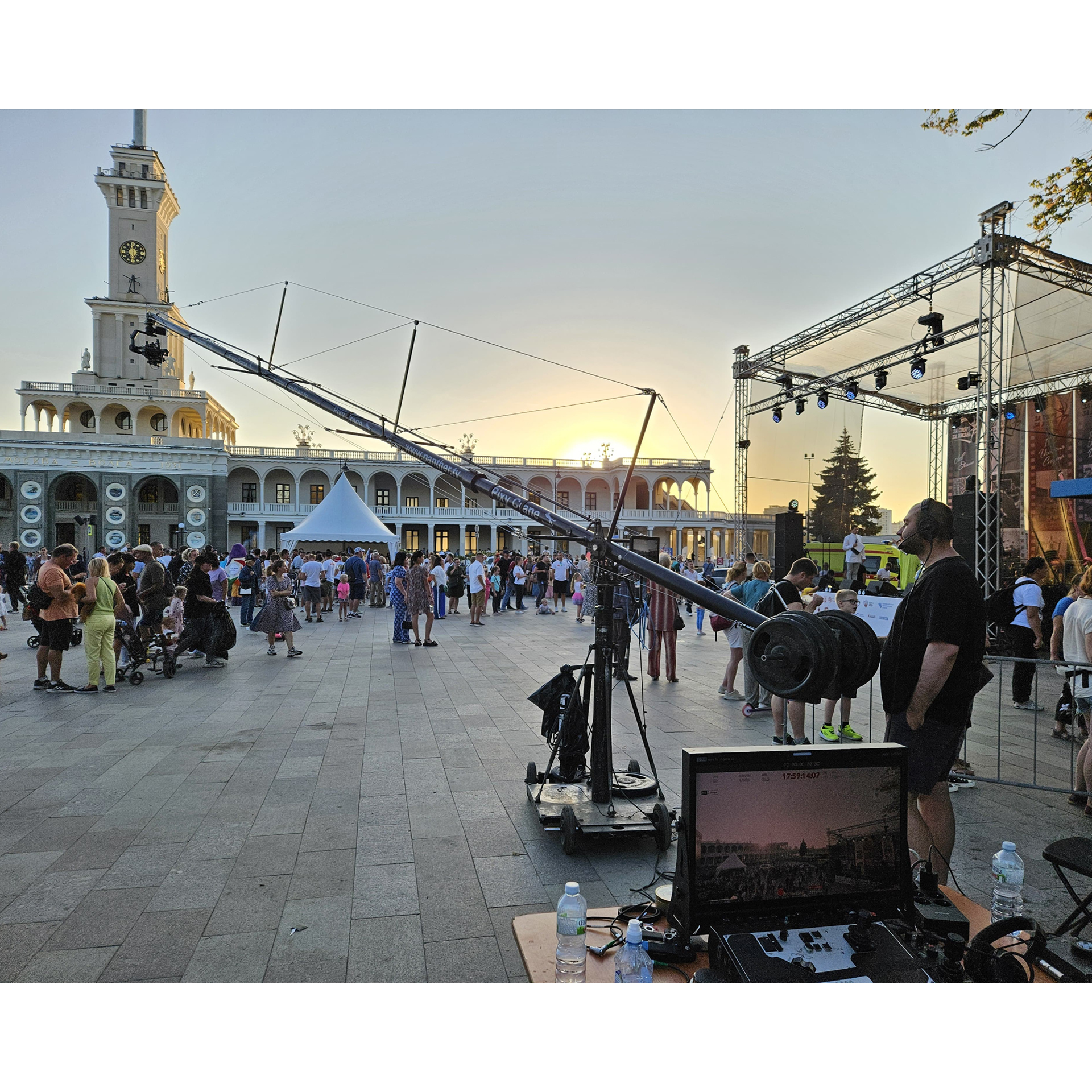 При использовании крана на максимальных длинах 8,5 и 10 м. или для реализации движения камеры по 3м степеням используется гиростабилизированная голова "Ronin 2" на которую уже нельзя ставить габаритные кино и телевизионные(канальные) камеры.